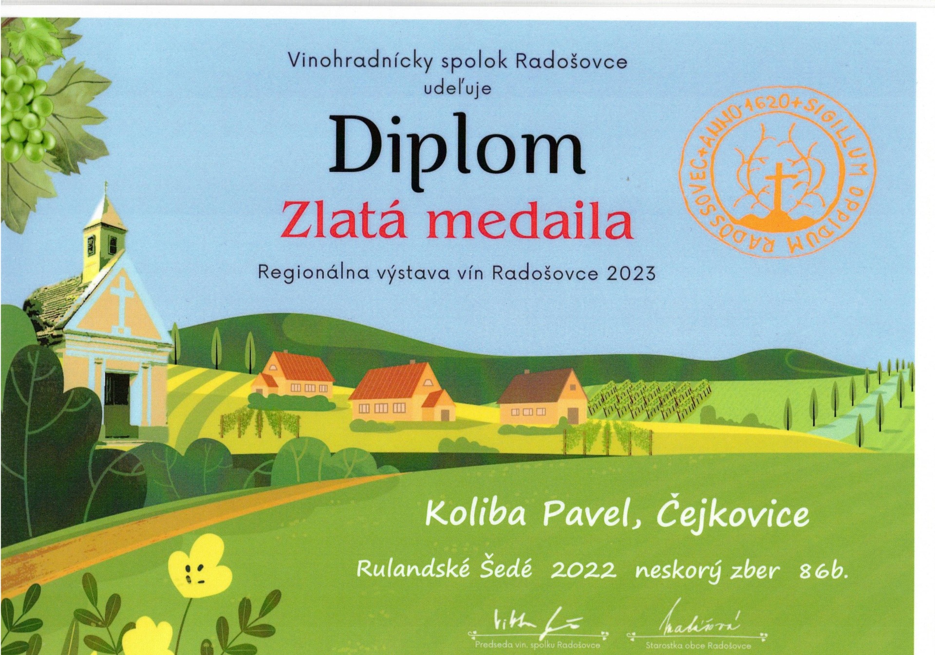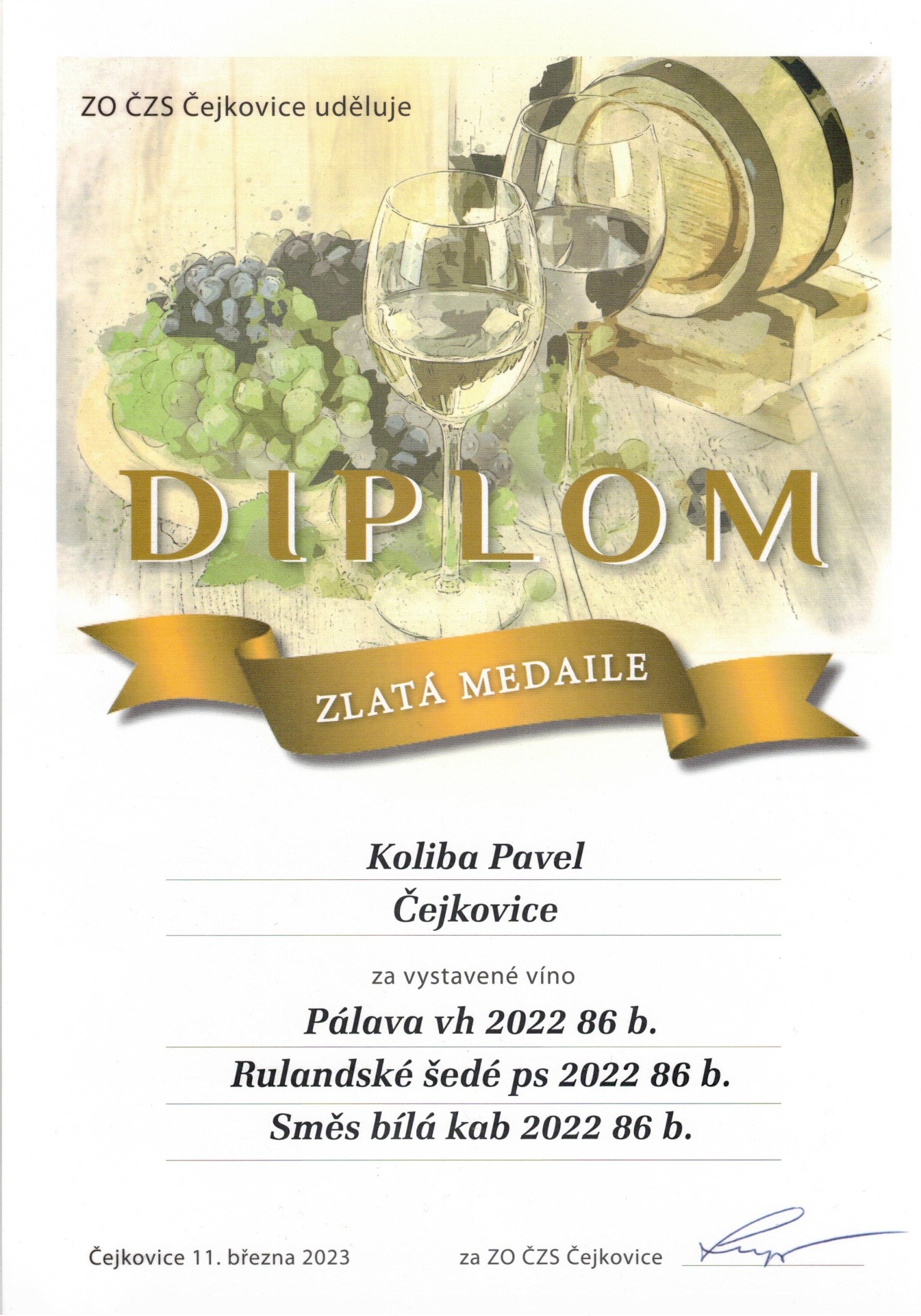 Typická barva s bronzovými odlesky po delší maceraci hroznů na slupkách. Výrazná vůně se stopami meruněk a hruškového kompotu je doplněna nasládlou chutí s jemnou kyselinkou v závěru vína.